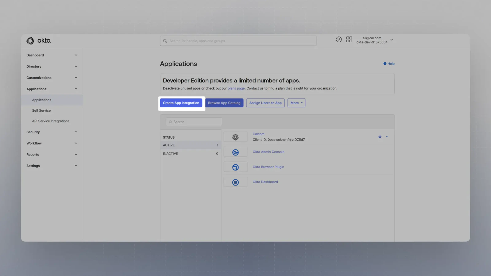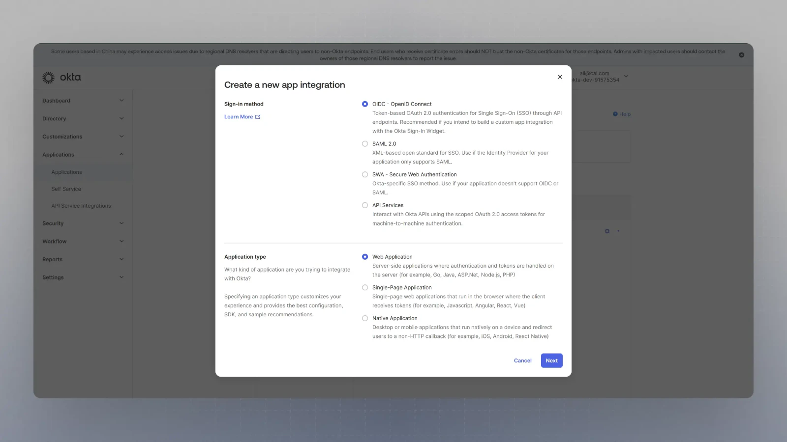 3. Create an application with your OIDC provider. For example, in Okta, once you create an account, you can click on Applications on the sidebar menu: