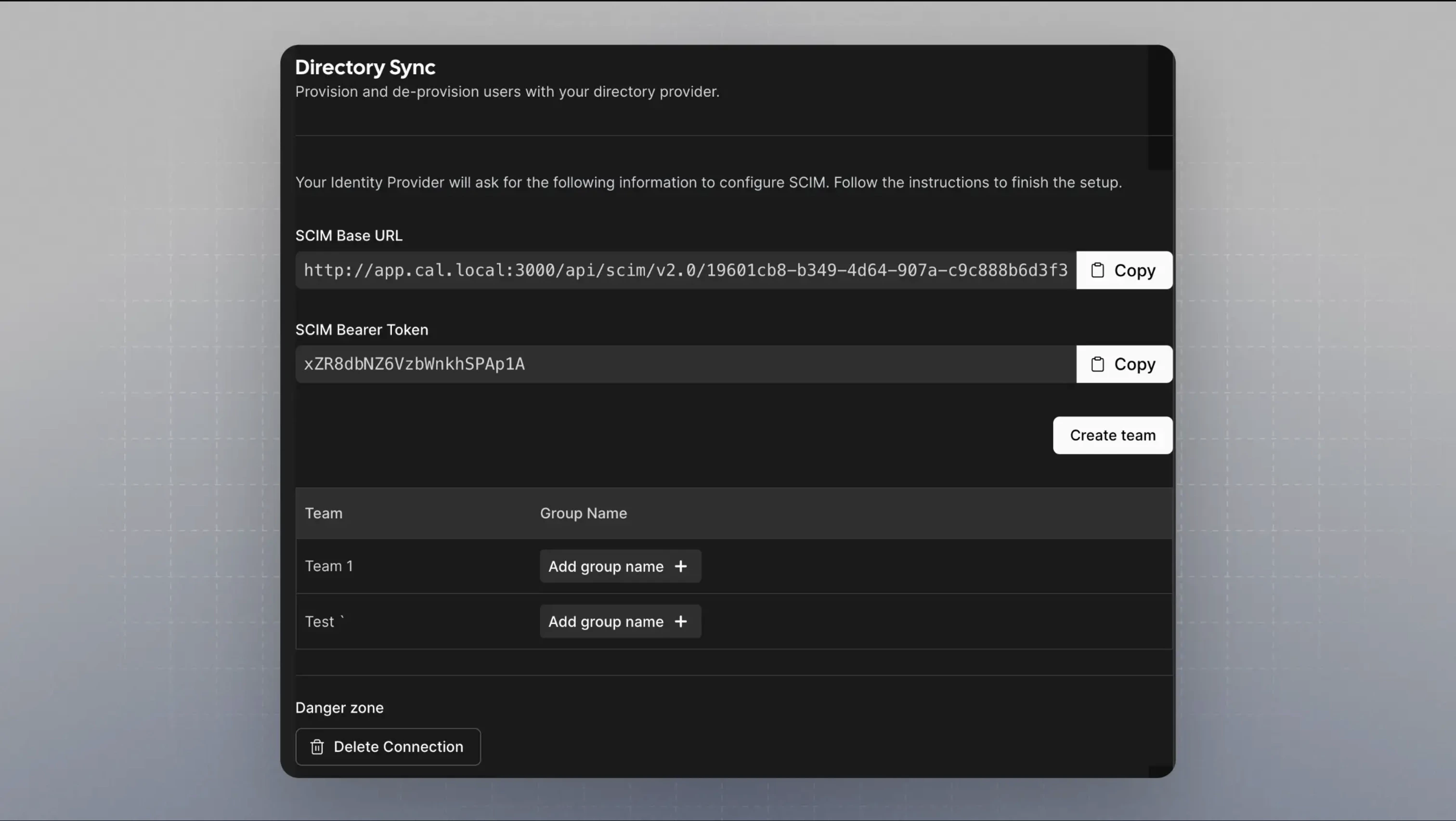 • Under “Authentication” enter the “SCIM Bearer Token” from Cal.com